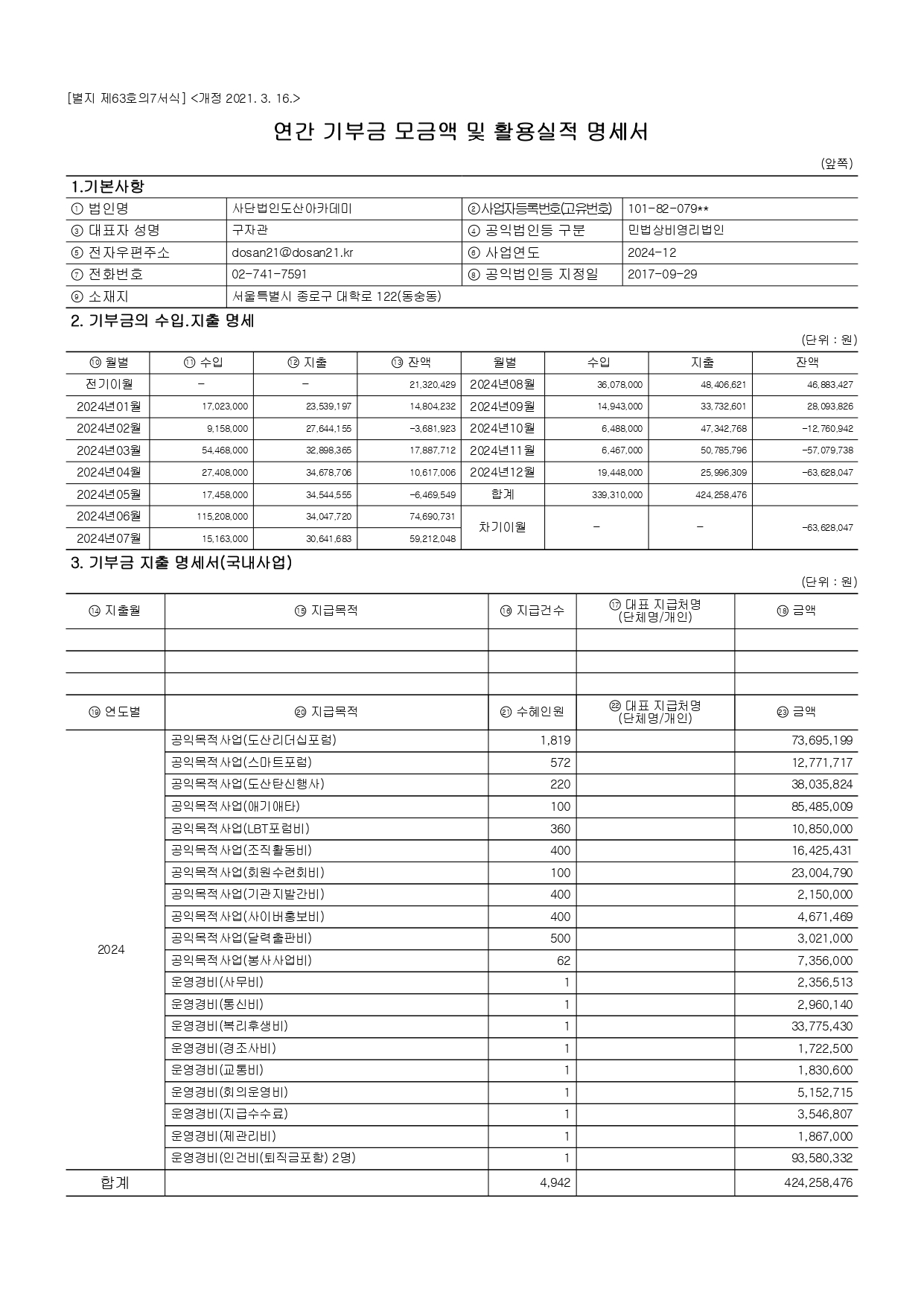 2024년도 기부금 모금액 및 활용실적 명세서 및 결산보고서