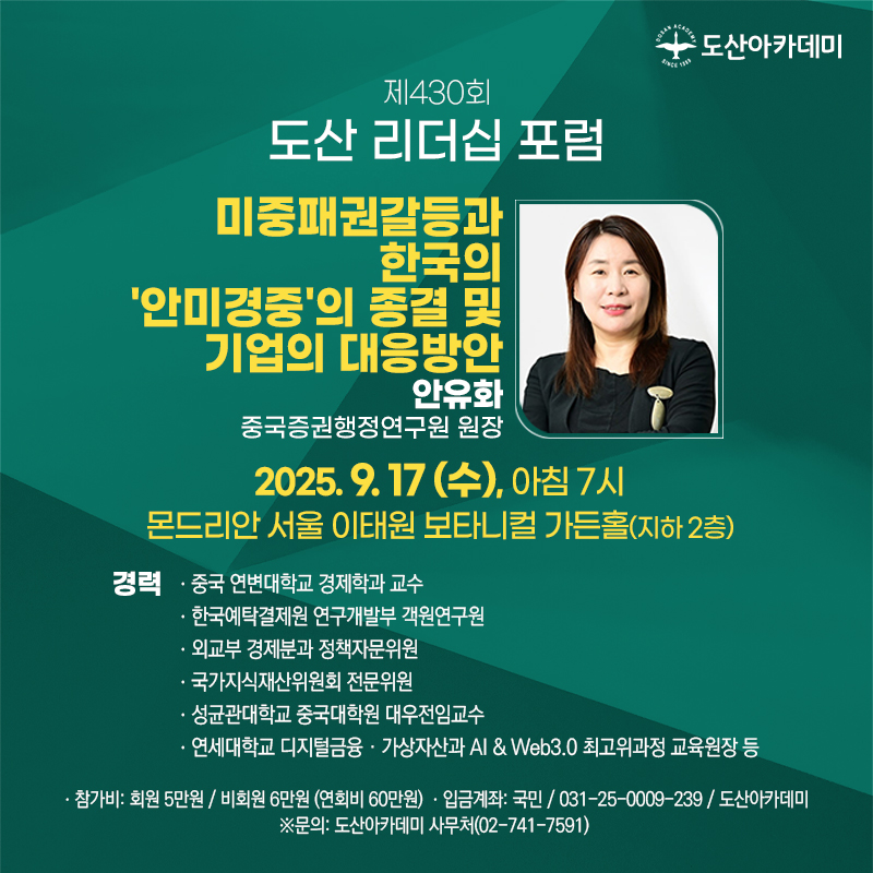 이번 포럼에서는 안유화 교수를 모시고 강연을 듣습니다. 안 교수는 중국‧한국‧미국을 아우르며 국제금융, 기업재무, 핀테크 분야에서 연구와 교육, 자문 활동을 이어온 국내 최고의 경제·금융 전문가로, 삼프로TV에도 자주 출연해 대중과 소통해왔습니다.